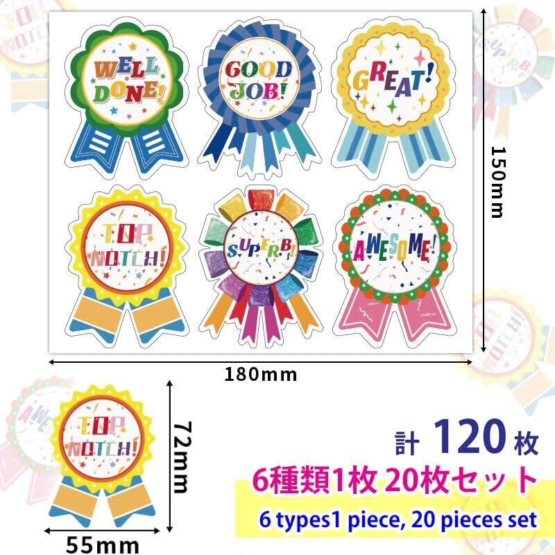 Abon Abon 【6種120枚】大きい ごほうび ロゼット シール 豪華 ご褒美 リボン 英語 おめでとう よくできました good job 勲章 パーティー 卒園 卒業