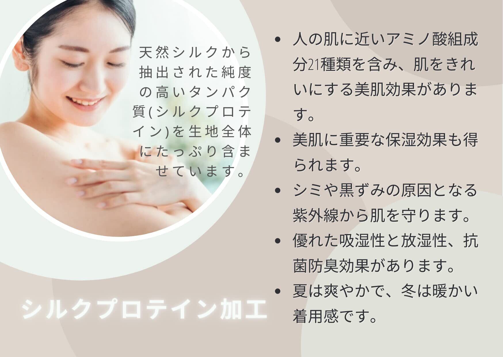 シルクプロテインをたっぷり染み込ませた肌ざわりの良い生地で、天然シルクの持つ特性である、美肌効果、保湿効果、抗菌防臭(デオドラント効果)紫外線(UV)防止効果 がプラスされています。