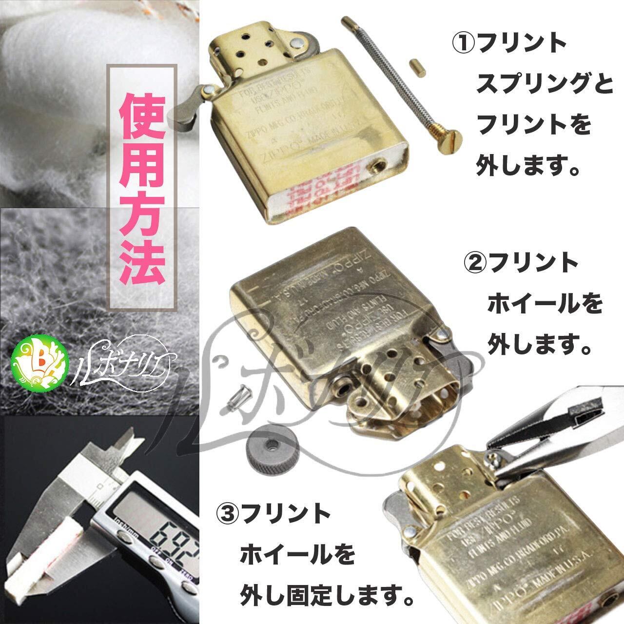 セット内容: ウィック(芯)、レーヨン(綿)、フェルトパッド、フリントホール、フリントスプリング
