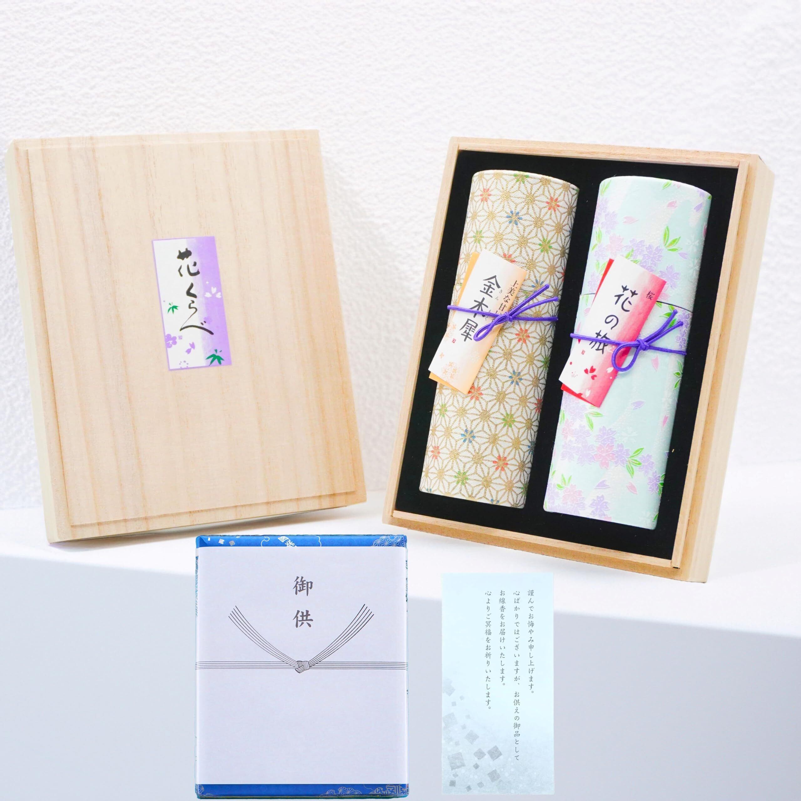 永楽屋オリジナル花くらべ 金木犀・桜の香り。包装を解いて頂くと、高級桐箱の中に可愛らしいパッケージに思わず心が和みます。筒型の華やかなパッケージに、金木犀・桜の香りの二種類のお線香が入っています。 御進物に最適な高級桐箱入り 家族葬やお悔やみを後から知って準備される時や仏事の法要や喪中見舞い、お盆の贈答品としてもお使いいただけます。 仏事全般でお使いいただける「御供」の結び切り熨斗付きです。
