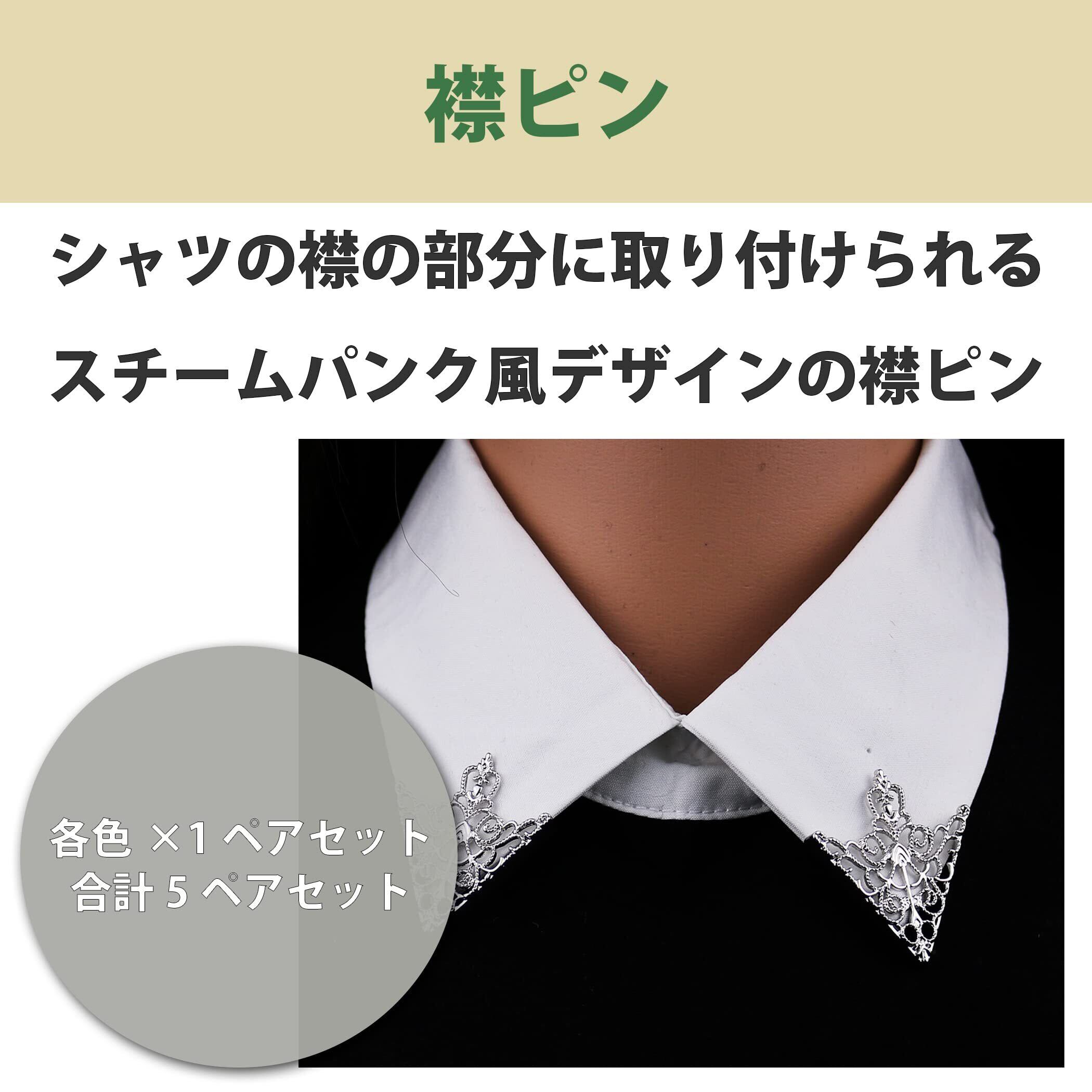 スチームパンク風デザインの襟ピン:シャツの襟の部分に取り付けてお使いいただけるスチームパンク風デザインの襟ピンです。5色の襟ピンが揃ったセット品なので、衣服のカラーやコスチュームに合わせて使い分けることもできます。