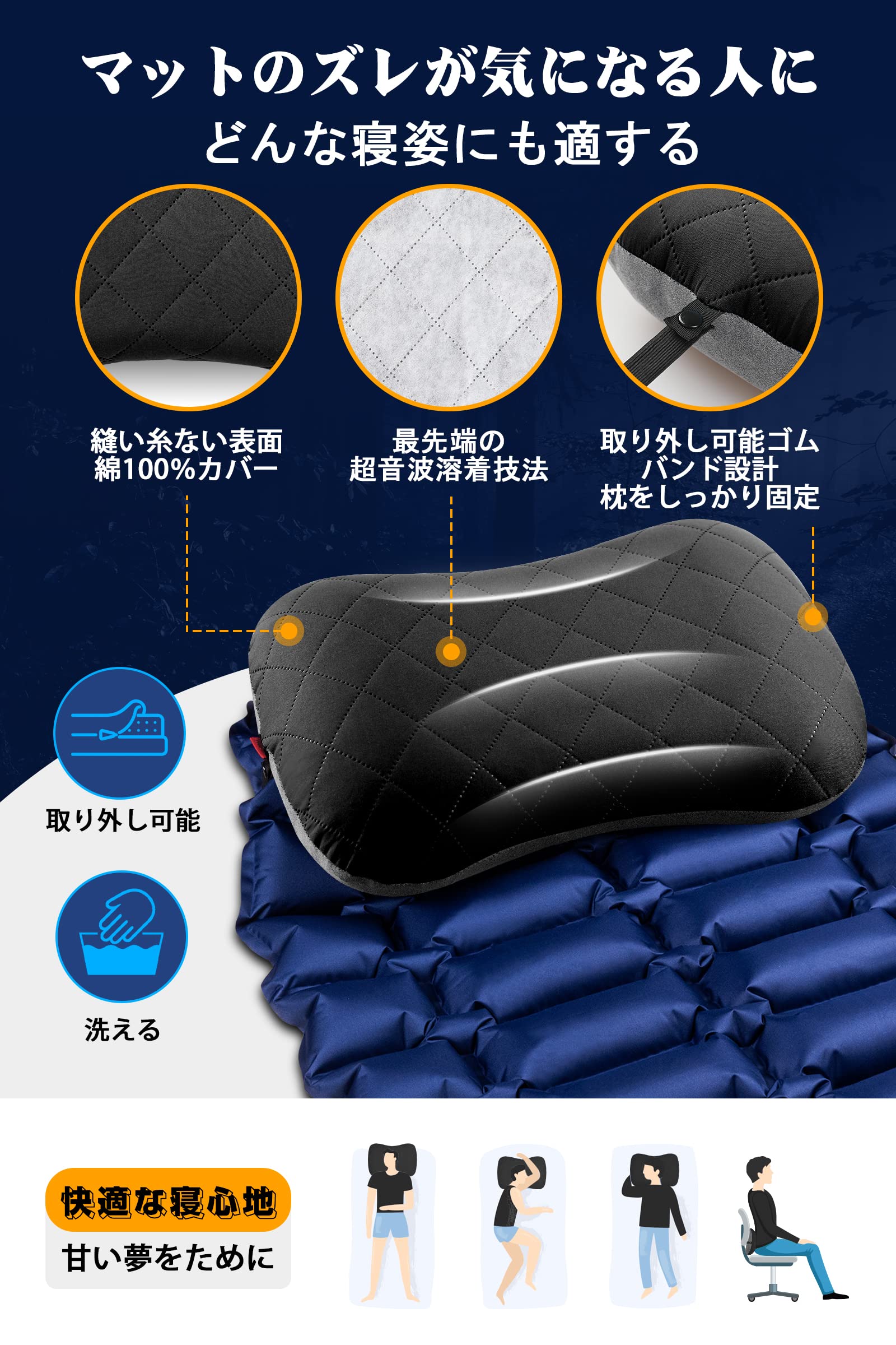 【絶妙な使用感・快適さはここから始まる!】このキャンプ 枕はコットンカバー付きで、通気性、柔らかの触感を提供します。枕カバーが汚され場合、クリーニングのために取り外すことができます。人間工学に基づいたエアー枕は、頭から首までしっかりサポートします!