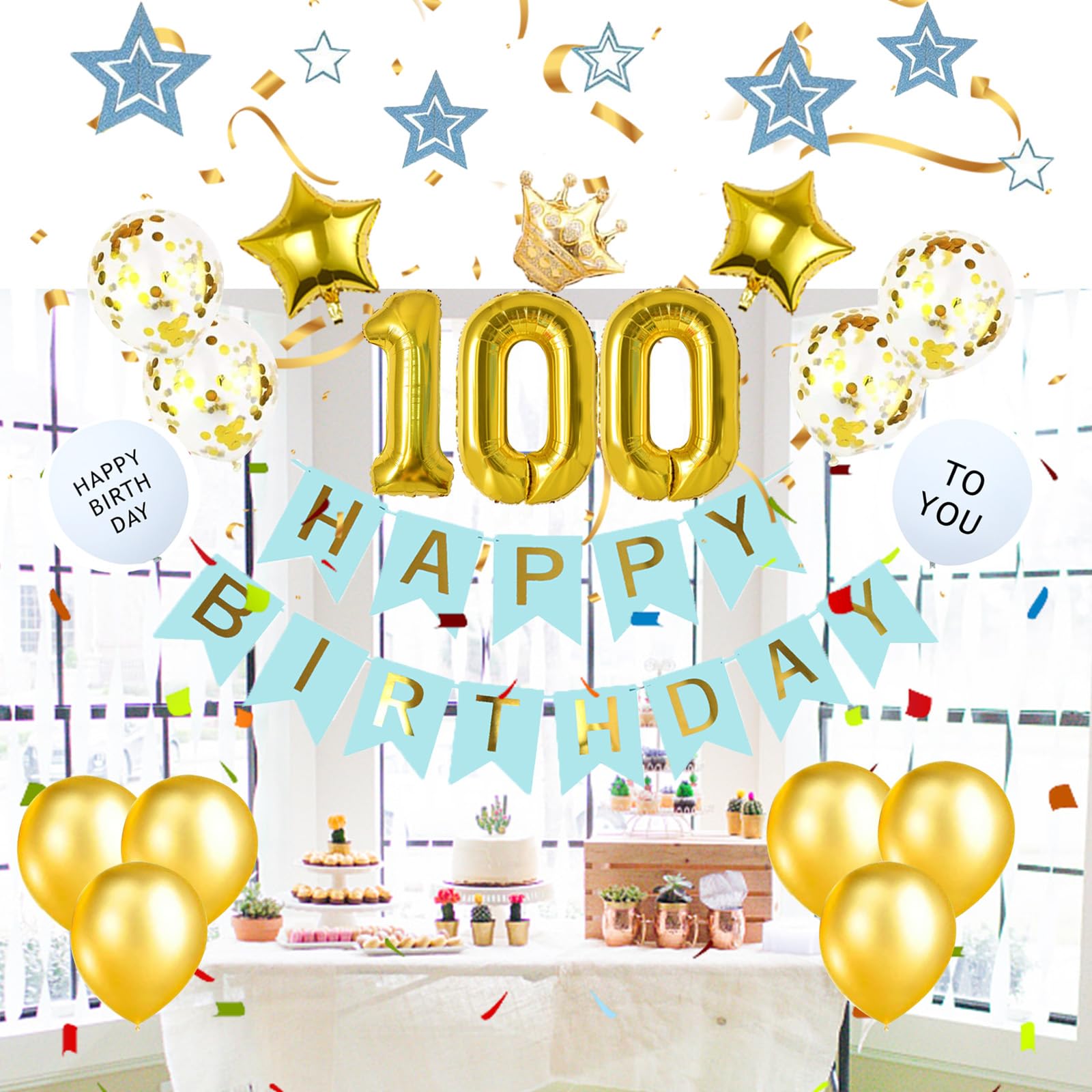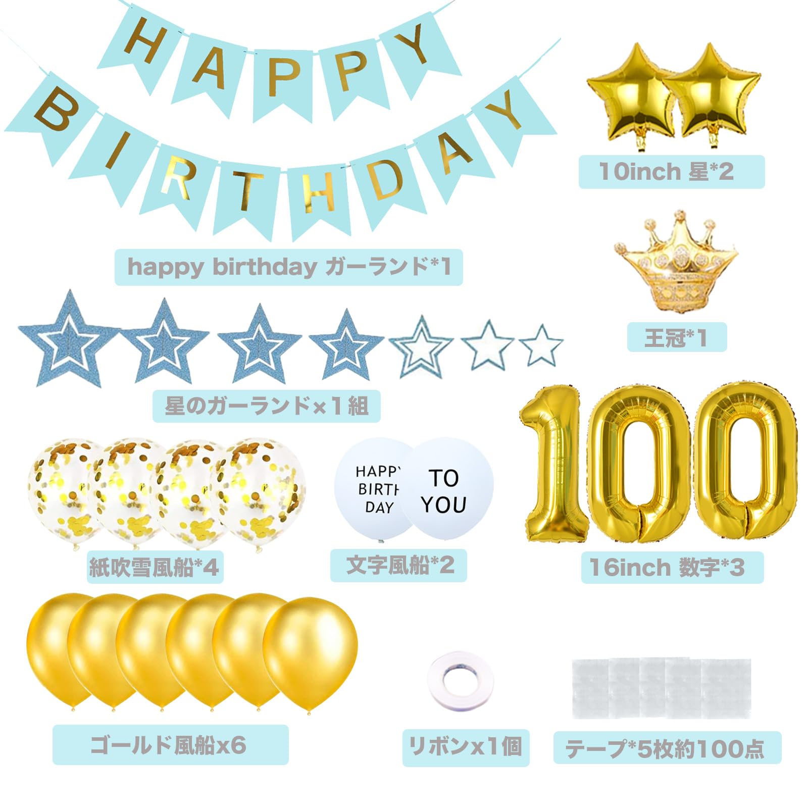 セット内容: happy birthday ブルー色ガーランドx1 旗サイズ:20cmx16cm 展開サイズ:約2m ブルー色紙製星ガーランドx1(7個星ガーランド) 10inch星バルーンx2(サイズ:25cm) 王冠バルーン*1(サイズ:30cm) ゴールド風船x6(サイズ:10inch) 金紙吹雪風船x4(サイズ:10inch) happy birthday文字入り風船x2(サイズ:10inch) 数字バルーン(100サイズ40cm) 付属品:リボンx1 バルーンテープ100点