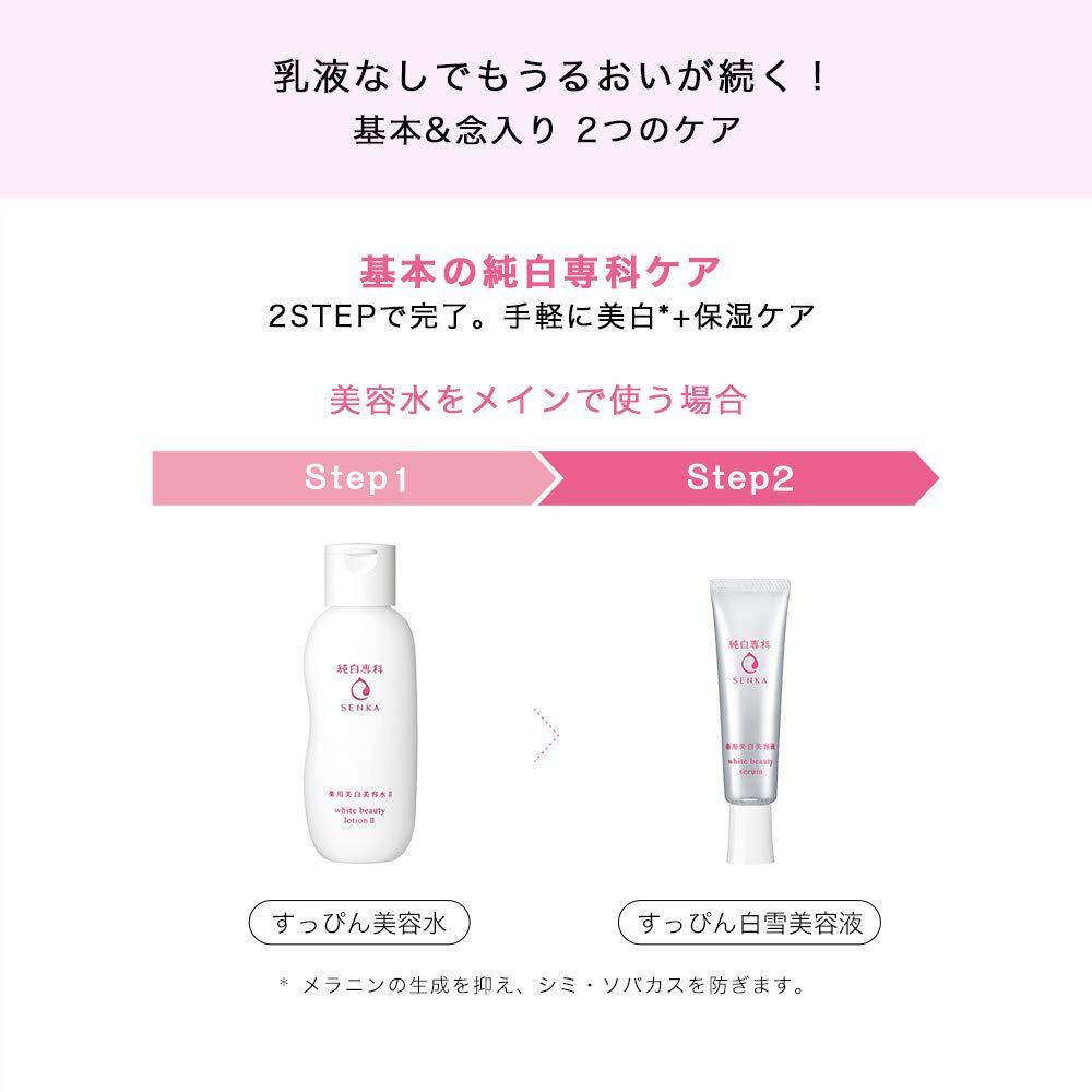 ◇飲み物ではありません。誤飲などを防ぐため、 置き場所にご注意ください。 ◇直射日光にあたってお肌に異常があらわれたときには、ご使用をおやめください。 ◇乳幼児の手の届かないところに置いてください。 ◇高温・日のあたるところに置かないでください。 ◇水道水や他の商品と混ぜないでください。 ◇雑菌が入るのを防ぐため、空のボトルの内側は洗わずにそのままご使用ください。 ◇本体ボトルの中味を使い切ってから、全量を詰め替えてください。 ◇キャップがきちんと閉まらなくなった場合は、本体ごとお求めください。 ◇詰め替え後は、袋の下部の製造記号(英数字)を控えておいてください。 お問い合わせの際に必要な場合があります。 ◇純白専科 すっぴん美容水 II (つめかえ用)は、純白専科 すっぴん美容水IIの本体ボトルに詰め替えてください。